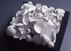 Holly Fischer uses porcelain to create these goregeous, figural forms. She focuses on a body part of the female anatomy and then encirlces it with abstract swirls of what looks to be fabric or water. The forms seem to just melt away into the air at the edges. Her pieces are beautifully finished with flawlessly smooth texture and solid ivory coloring.